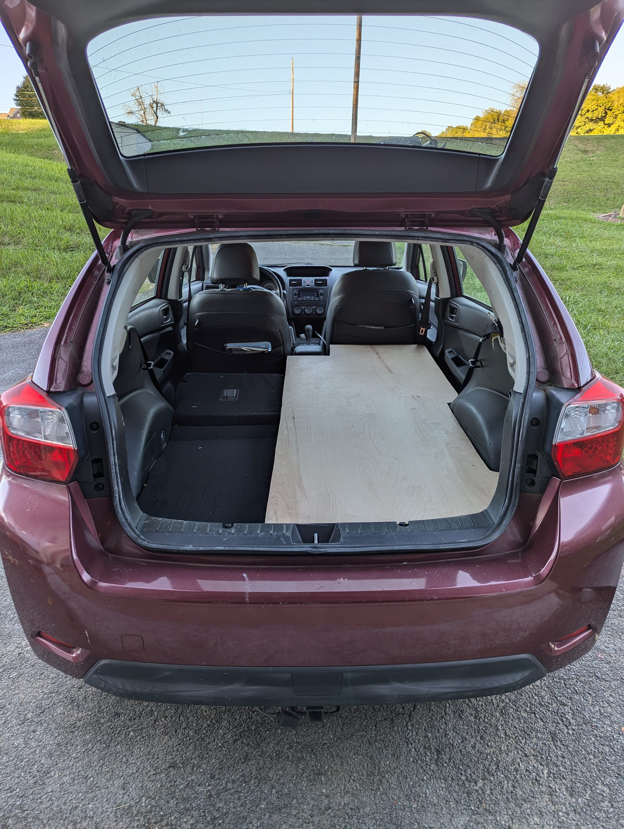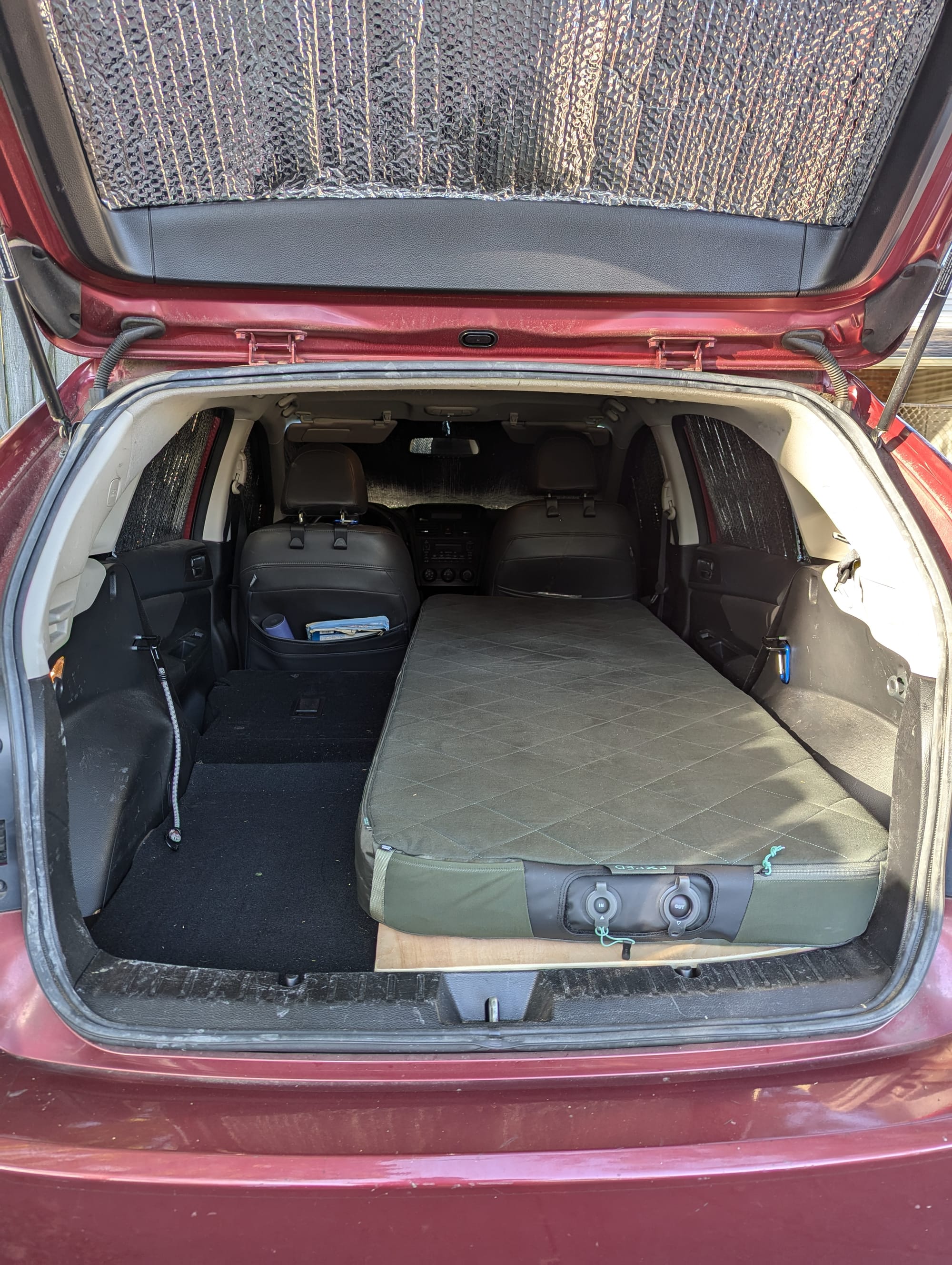 To get my feet wet in this world of off grid life, I did just enough work to create a drop-in sleeping platform for my car without any modifications to the interior. I cut out some plywood to fit snugly on the passenger side with about 26" of width at the narrowest, to fit a typical "wide" backpacking air mattress. A wonderful Exped Luxemat (which I got to try at Abby's apartment in Harlem) fits perfectly and with supreme comfort at this size. The back seat behind the driver still operates for passengers.