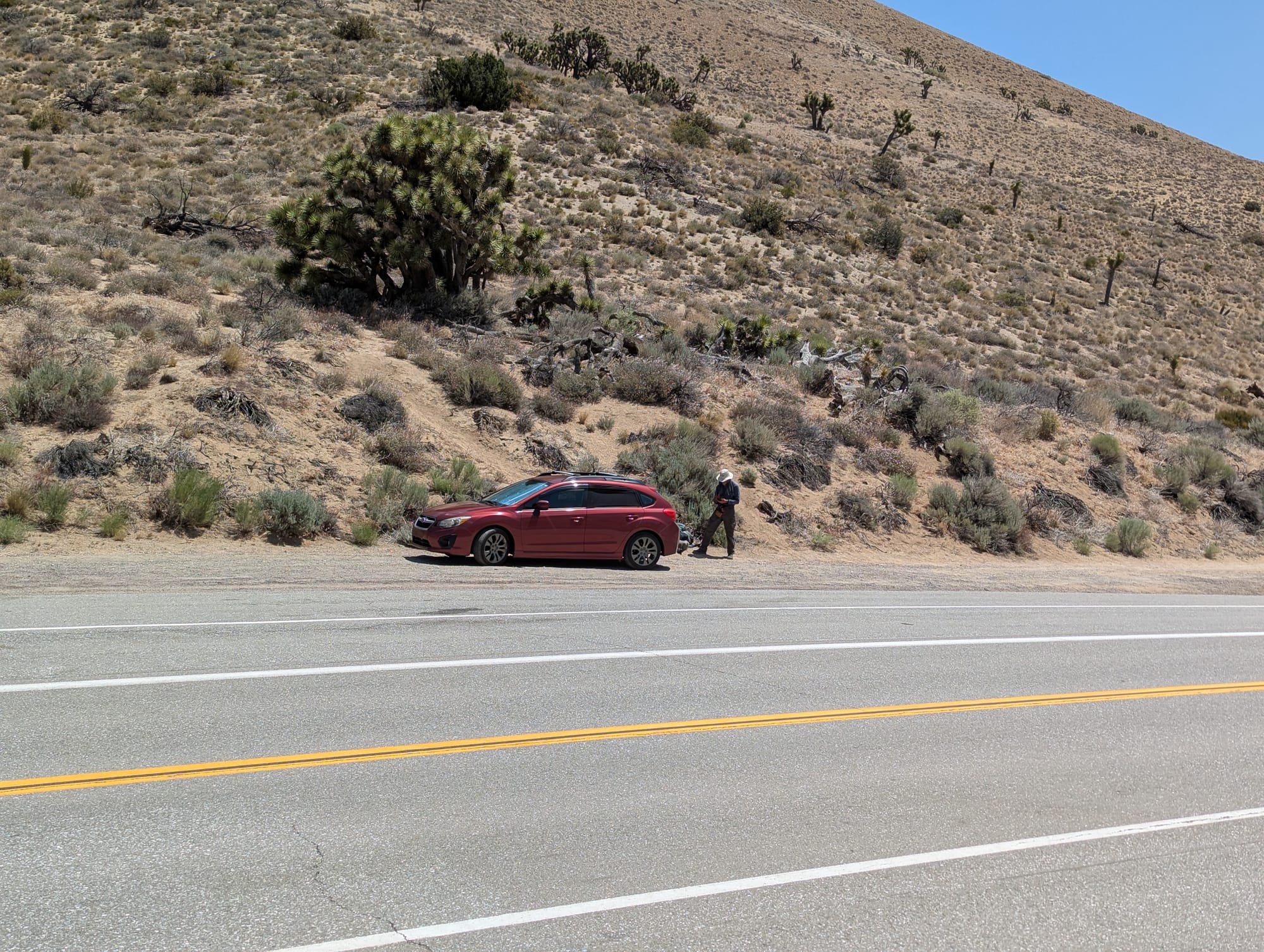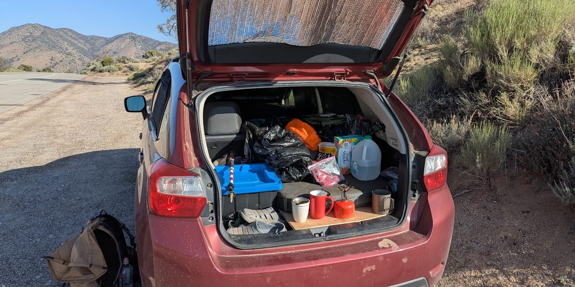 Later in the year, on my way from the Grand Canyon to central California, I stopped to trail magic a former co-worker who is hiking the PCT. He had given me access to his satellite tracker location, so I found a convenient road crossing north of his position and set up on the shoulder with a less comprehensive snack, drink and trash outfit.
